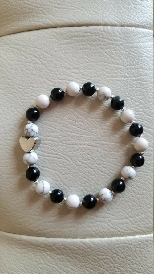 Shining beaded bracelet with heart shaped silver colored beads strung on stretchy cord. Bracelet stretches and fits an average wrist size: approximately 7.5 inches.