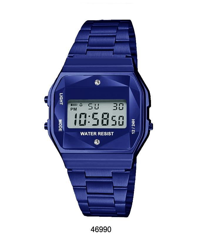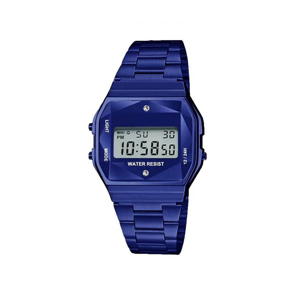 Tyrkysové športové hodinky s kovovým remienkom, tyrkysovým kovovým puzdrom a tyrkysovým LCD displejom s brúseným krištáľom