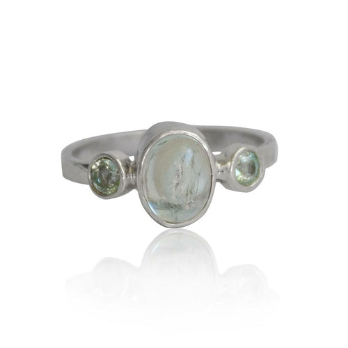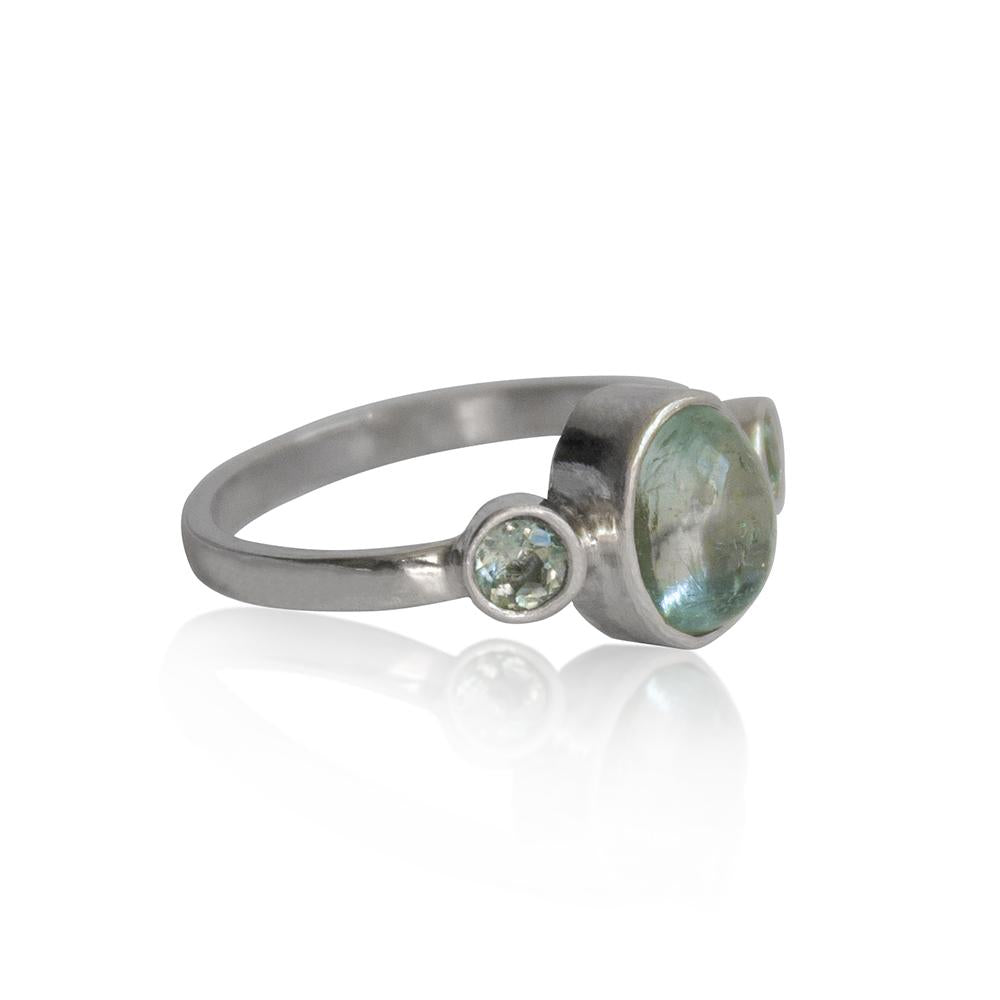 Akvamarín sa pýši svojím jedinečným modrozeleným odtieňom. Pochváľte sa svojou jedinečnosťou s týmto štýlovým prsteňom. Jeden oválny akvamarín obklopený dvoma menšími akvamarínmi. Ideálny ako prsteň s kameňom narodenia alebo len preto, že milujete túto farbu.