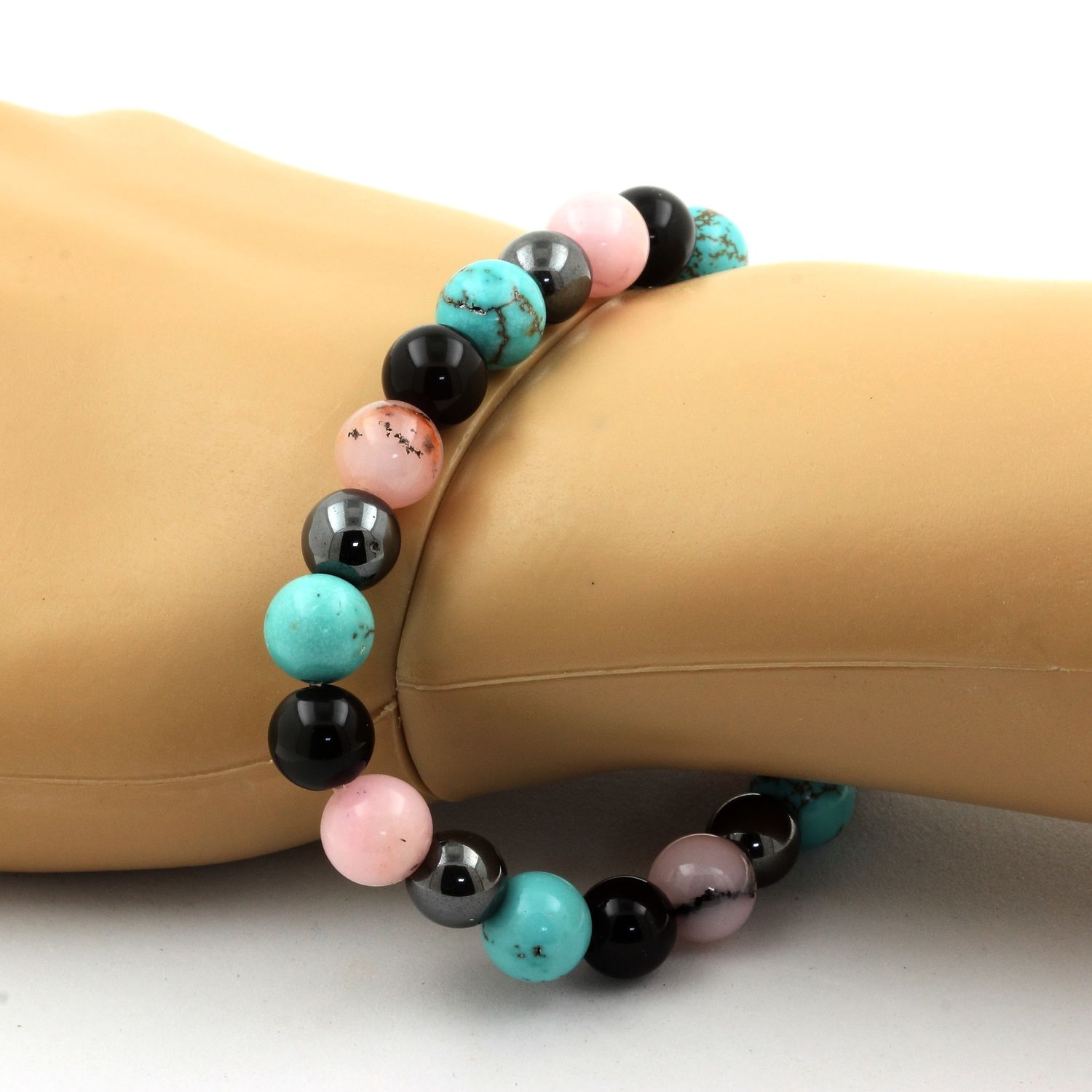 Náramok s čiernym obsidiánom + hematitom + ružovým opálom a tyrkysovými korálkami 8 mm.