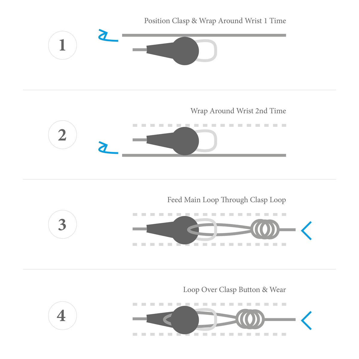 Tento náramok má univerzálnu veľkosť, pričom koža sa dá natiahnuť alebo zopnúť podľa veľkosti vášho zápästia. Ak si chcete náramok nasadiť alebo zložiť, jednoducho posuňte jeden nastaviteľný uzol okolo kože, čím zmenšíte alebo zväčšíte veľkosť slučky. Po nastavení si udržíte konzistentnú veľkosť slučky a pokračujte v nosení jednoduchým odopnutím slučky cez sponu. Ako je znázornené na obrázku, náramok je najbezpečnejší, keď je kožená slučka prevlečená cez menšiu slučku, ktorá vyčnieva za sponu.