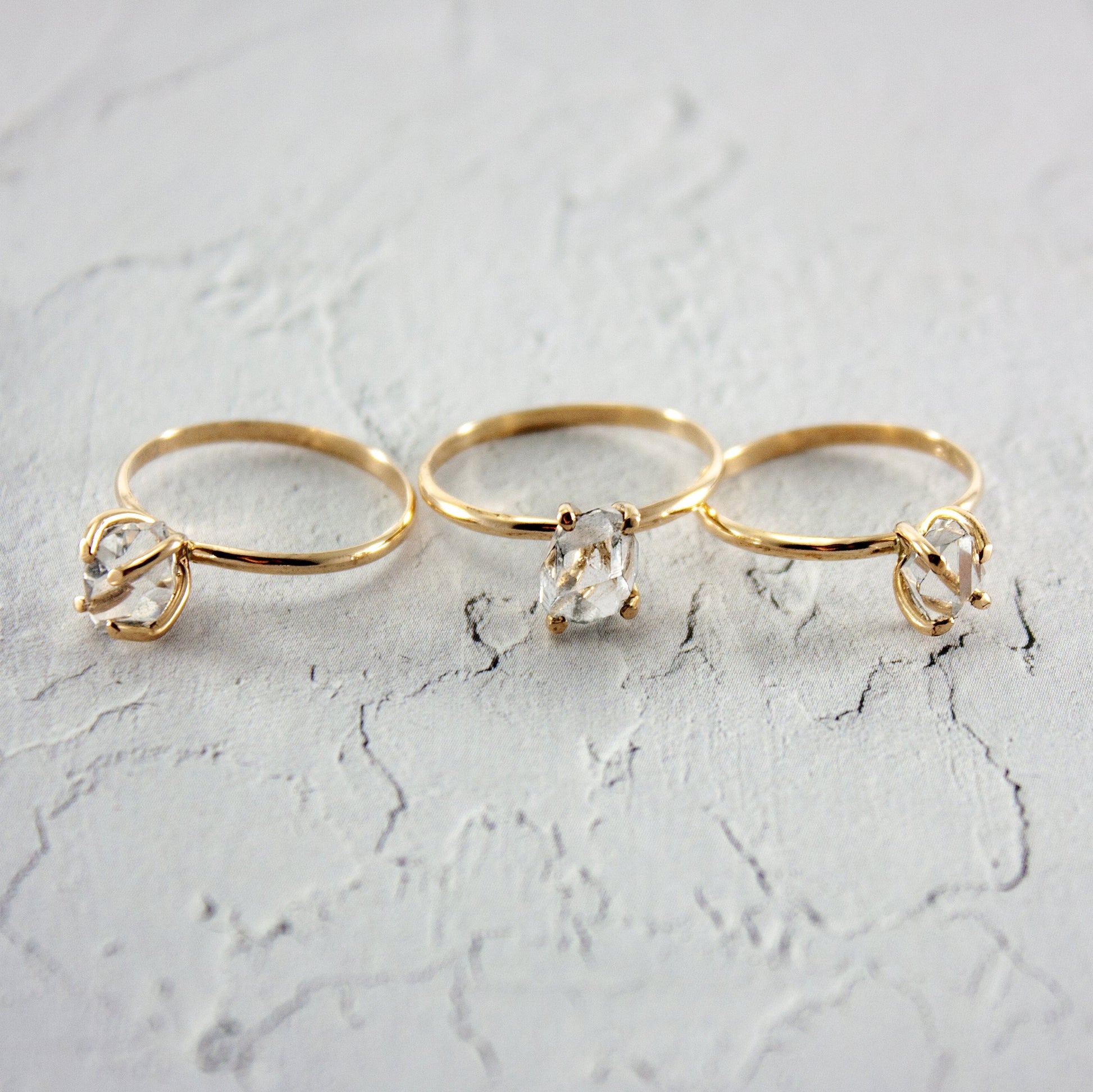 Tento unikátny kremenný drahokam, známy ako diamant Herkimer, úžasne vyniká sám o sebe v štvorcípom osadení. Prsteň zo 14-karátového zlata kontrastuje s čírym diamantom Herkimer, ktorého vysoký lesk a trblietanie vám dodávajú pocit diamantu. Tento prsteň je nádherným a nezabudnuteľným darčekom alebo dokonca alternatívnym zásnubným prsteňom.