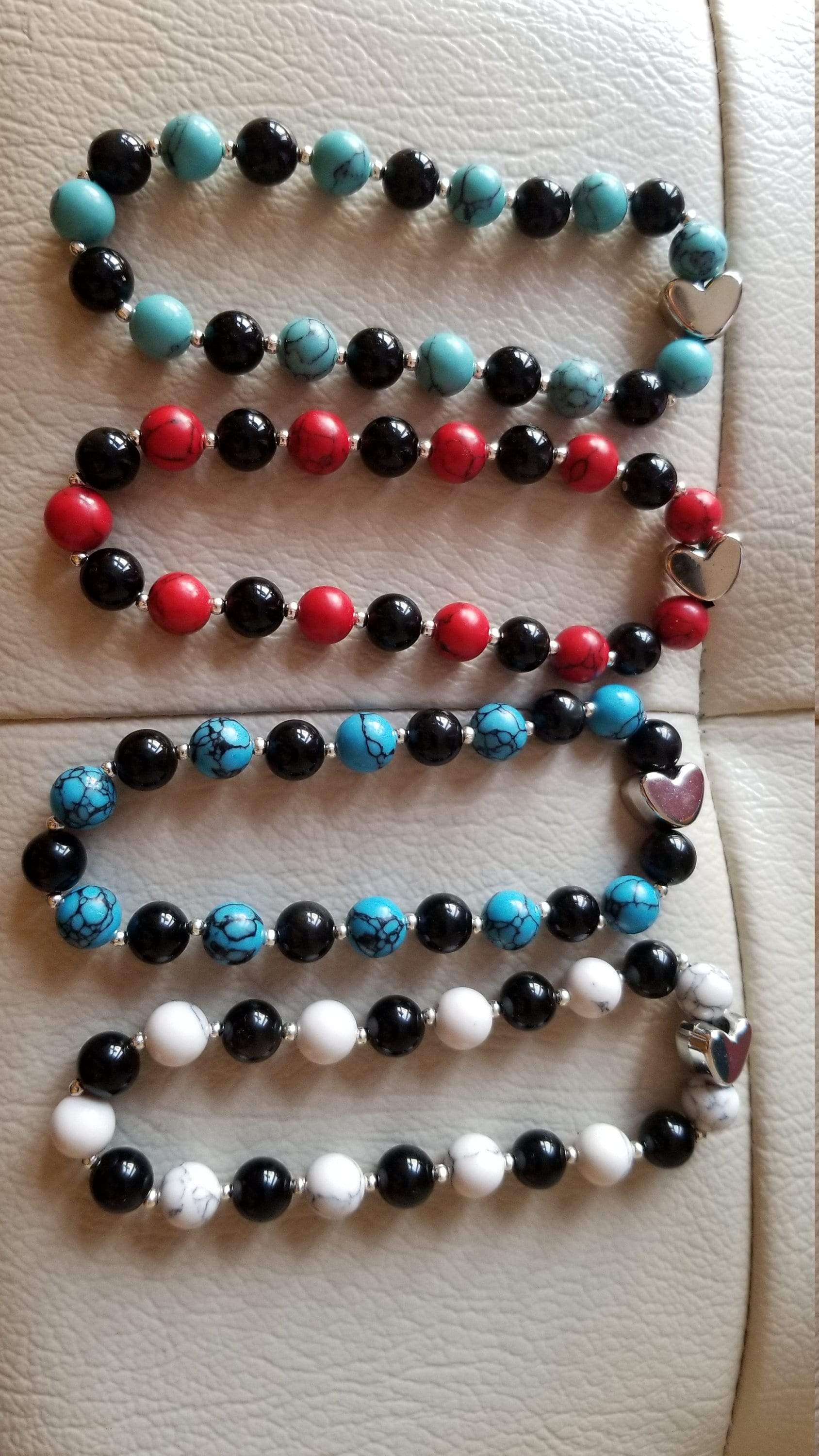 Žiarivý korálkový náramok so striebornými korálkami v tvare srdca navlečenými na elastickej šnúrke. Náramok sa dá natiahnuť a hodí sa na priemernú veľkosť zápästia: približne 19 cm.